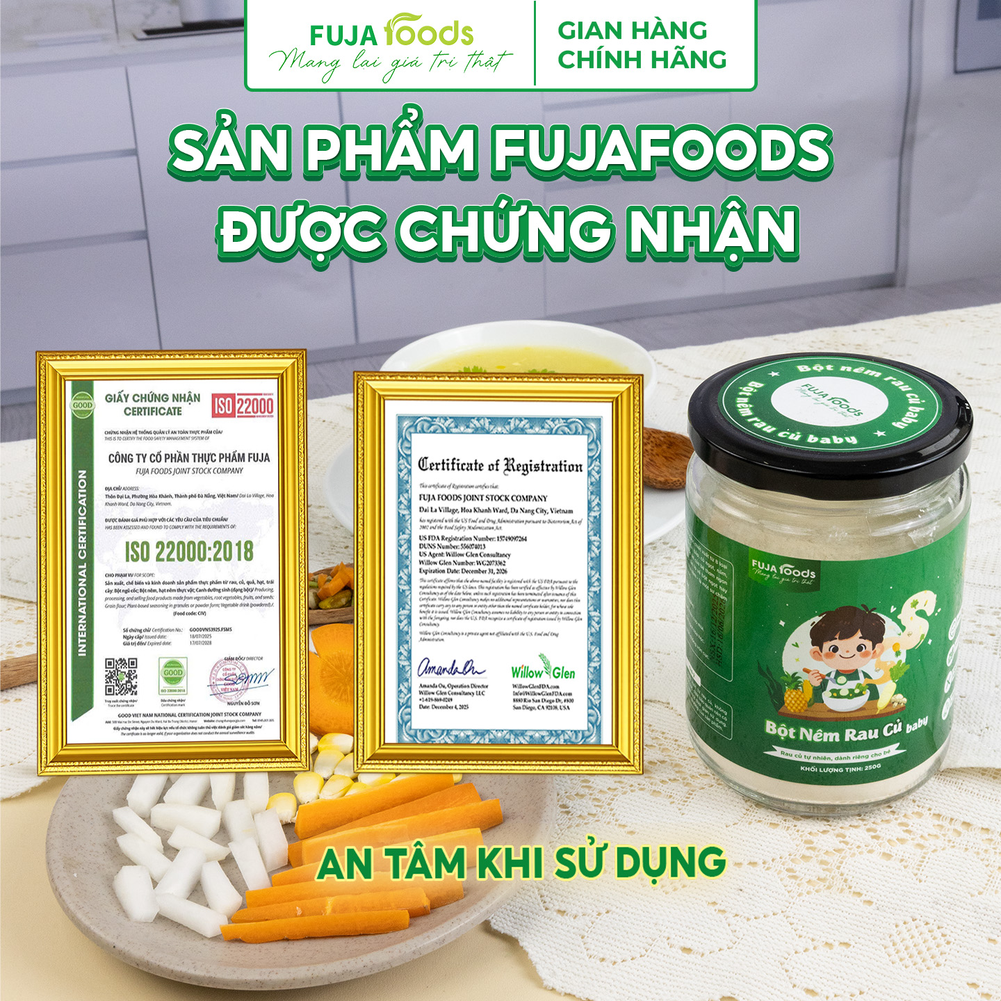 Bột nêm rau củ Baby FujaFoods được tạo nên từ những nguyên liệu tươi sạch, . Từng loại rau củ được lựa chọn kỹ lưỡng để đảm bảo hương vị tự nhiên và an toàn tuyệt đối cho sức khỏe của bé: